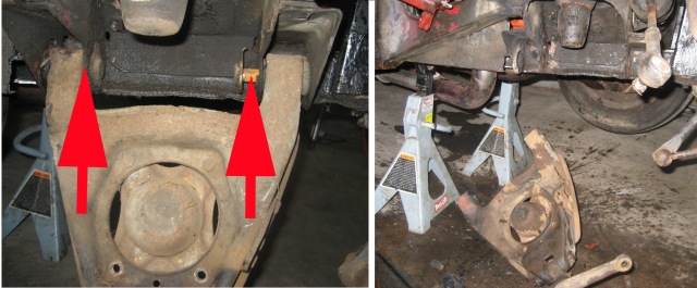 Right here are the bad boy inner fulcrum pins. There are a zillion posts asking how to get these out. I can't say there is any secret ... just take the nut off and hammer the bolt(pin) out. Many people have just cut these things off with a saws-all. I had trouble getting at the one side on mine because of the exhaust so I put a torch to it and almost set my car on fire. I was able to poke the other side right out. Take note that moving the wishbone up and down may change the pressure on these and make it easier. After you get these out .. the whole assembly will drop to the floor, ready to take to the bench.